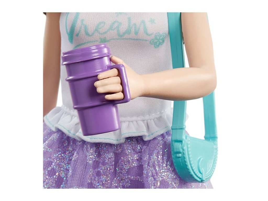 - Panenka je oblečena do fialkové třpytivé sukně po kolena a světlého topu s nápisem. Vlasy jí zdobí čelenka, v jedné ruce nese šálek, ve druhé mobil, přes rameno má kableku. K oblečení jí ladí boty.