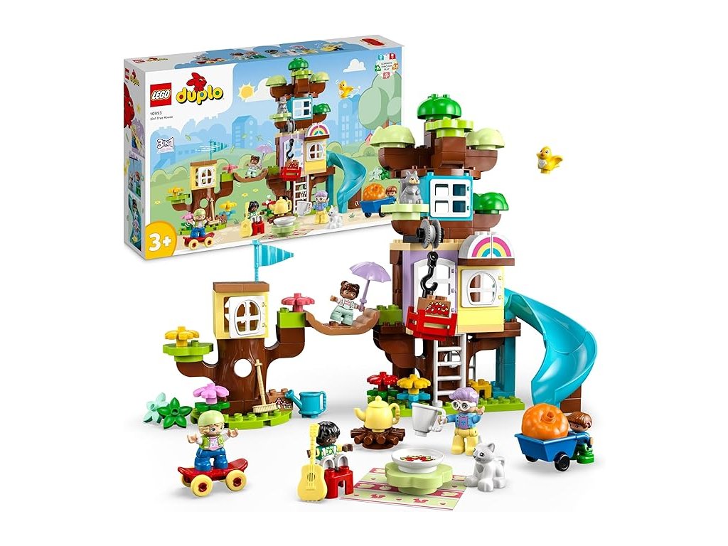 Malí dobrodruhové od 3 let objeví spoustu možností, jak se pobavit při prozkoumávání stavebnice Dům na stromě 3 v 1 od LEGO® DUPLO® (10933). Tento stavebnicový set je plný funkcí a díky možnosti přestavení do 3 podob inspiruje ke kreativnímu stavění. Učení hrou podněcuje představivost Děti nejprve postaví dechberoucí dobrodružný prostor na hraní se 3 patry, extra dlouhou skluzavkou a vratkým mostem. Pokud se začnou stahovat dešťové mraky, model lze přeskládat na útulný dům na stromě. Třetí model se skládá ze 2 domů na stromě, z nichž každý má vlastní skluzavku, a zahrádky, kde děti mohou sbírat ovoce a nosit je domů pomocí roztomilé kladky. I nejmenší se učí hrou Součástí této sady je pestrá řada postav včetně figurky babičky, 4 dětí a kočky a veverky. Rodiče si tak mohou hrát se svými nejmenšími a rozvíjet jejich sociální dovednosti a společné hraní. Celá řada kreativních doplňků malým stavitelům pomůže prozkoumávat sebevyjádření a inspiruje je k vymýšlení bezpočtu nápaditých příběhů.