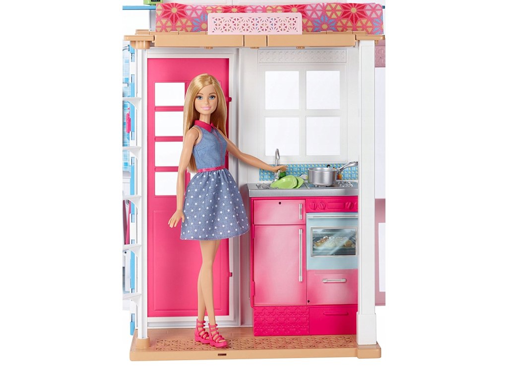 Tento originální Barbie® dům 2v1 inspiruje k nekonečnému hraní příběhů s panenkou Barbie. Součástí je malý balének, lehátko, několik pčekvapení v podobě ukrytého obrazu, pečíčí trouby, skryté police. V domku je k dispozici velké množství příslušenství, nádoobí. Celý set se dá složit, aby bylo jeho přenášení snadné. Panenka Barbie je připravena na celodenní hraní v šatech s moderními puntíky a stylových růžových botičkách. Rozložený domek má na šířku 76cm. Domek je dvoupatrový.