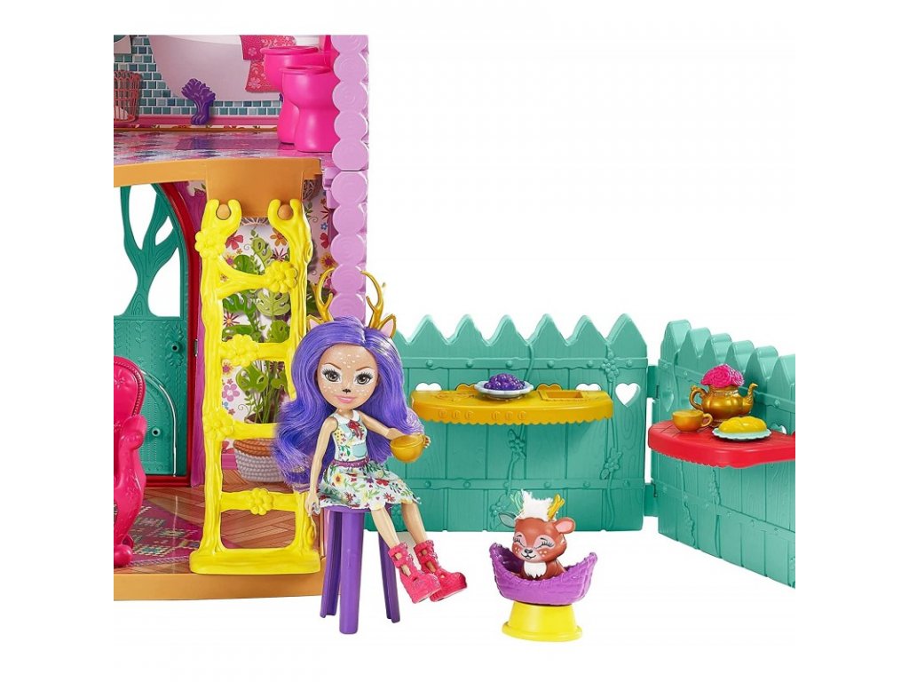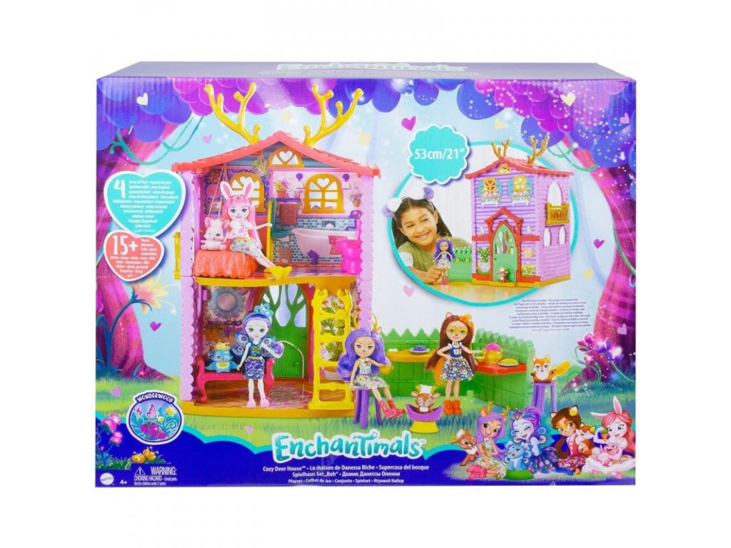 Vítejte v jelením domě Enchantimals ™! Se 4 hracími plochami, více než 15 doplňky a výškou 53 cm nabízí tento herní set nekonečné hodiny sladkého hraní. Panenka Danessa Jelínková a její mazlíček Sprint ™ si rádi užívají společné chvíle v útulném domě! Uvařte si něco dobrého k snědku ve venkovní kuchyni, odpočiňte si na gauči v obývacím pokoji, zkrášlete se společně v koupelně nebo si dopřejte sladké sny v ložnici. Pozvěte další přátele Enchantimals a užijte si ještě více zábavy (prodávají se samostatně)! Barvy a dekorace se mohou lišit.