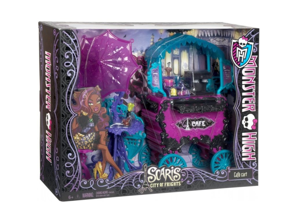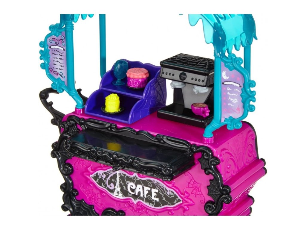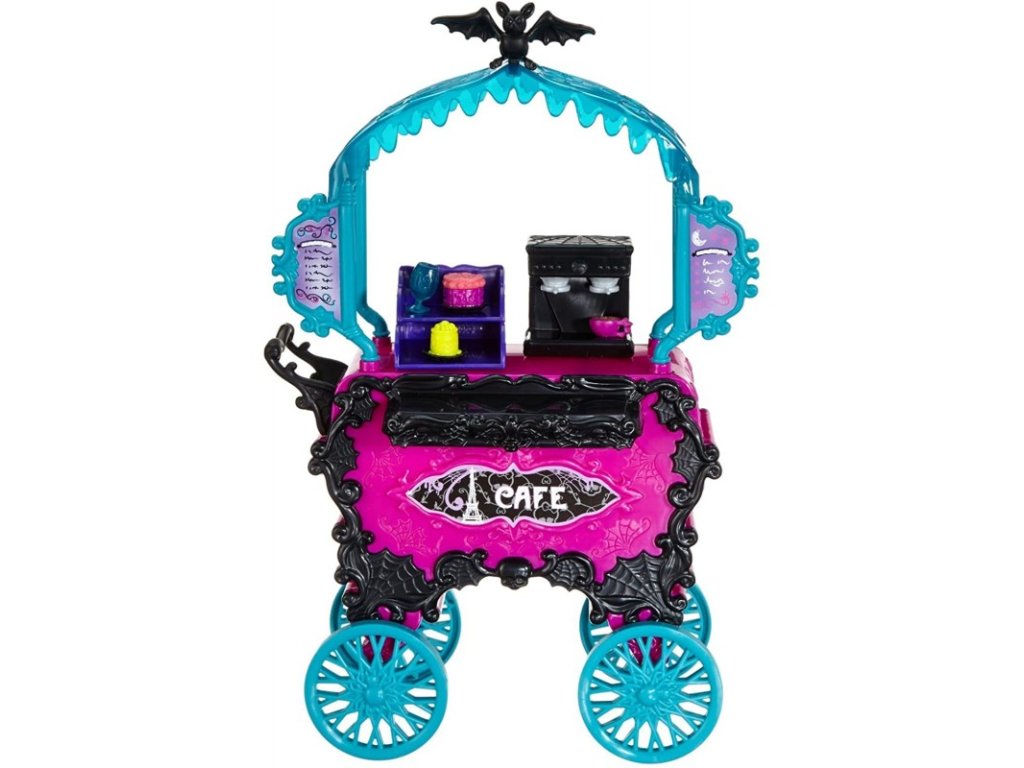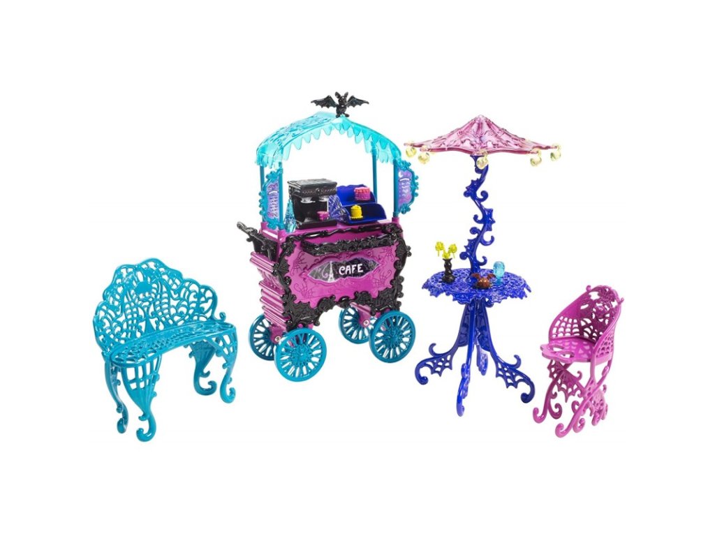 Monster High panenky mají nyní možnost dát si kávu se strašidelné kavárně. V setu nechybí stoleček, židlička, slunečník a kavárenský vozík s veškerým příslušenstvím.