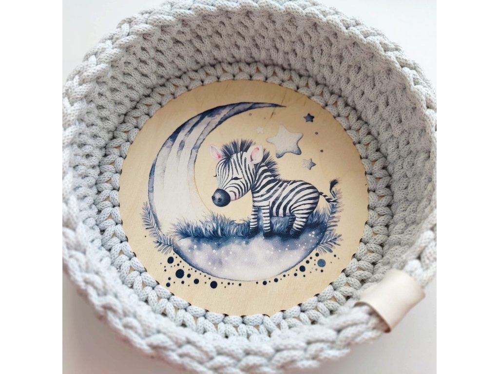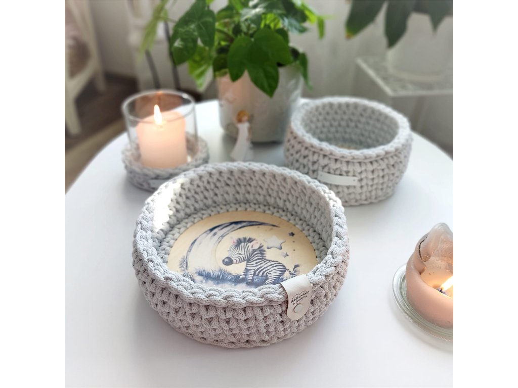 Sada se skládá: košíček je o průměru 20 cm a výšce 7 cm s dekorem roztomilé zebry, 15 cm a výšce 9 cm se sym a poslední se sklem na čajovou svíčku je o průměru 10cm a výšce 11 cm se slem.