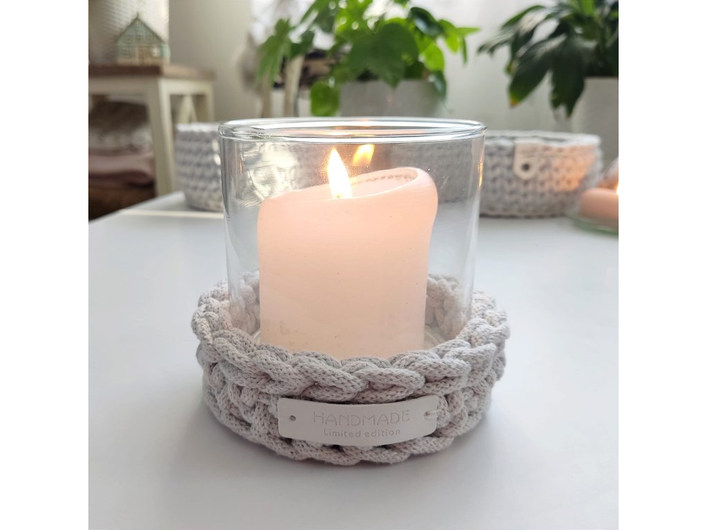Košíčky jsou háčkované z kvalitních, zdravotně nezávadných bavlněných šňůr, stejně tak jako obal na svíčku. V obalu je vloženo sklo určené přímo k použití na svíčku. Sklo lze vyjmout a můžete použít jaké jako menší košíček. Vhodné na čajovou svíčku nebo svíčku "umělou".